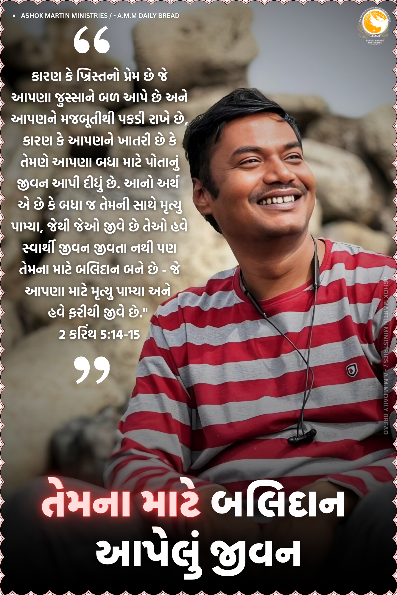 `કારણ કે ખ્રિસ્તનો પ્રેમ છે જે આપણા જુસ્સાને બળ આપે છે અને આપણને મજબૂતીથી પકડી રાખે છે, કારણ કે આપણને ખાતરી છે કે તેમણે આપણા બધા માટે પોતાનું જીવન આપી દીધું છે. આનો અર્થ એ છે કે બધા જ તેમની સાથે મૃત્યુ પામ્યા, જેથી જેઓ જીવે છે તેઓ હવે સ્વાર્થી જીવન જીવતા નથી પણ તેમના માટે બલિદાન બને છે – જે આપણા માટે મૃત્યુ પામ્યા અને હવે ફરીથી જીવે છે.” 2 કરિંથ 5:14-15 TPT અનુસાર`