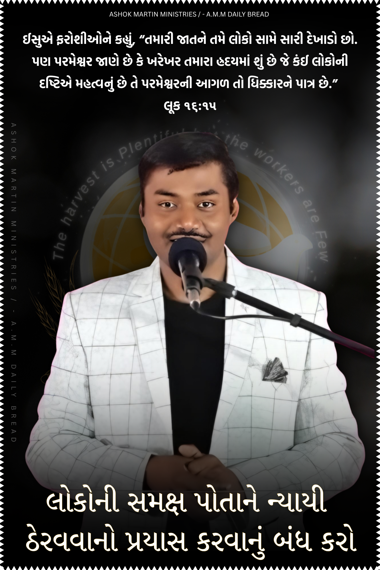 `ઈસુએ ફરોશીઓને કહ્યું, “તમારી જાતને તમે લોકો સામે સારી દેખાડો છો. પણ પરમેશ્વર જાણે છે કે ખરેખર તમારા હ્રદયમાં શું છે જે કંઈ લોકોની દષ્ટિએ મહત્વનું છે તે પરમેશ્વરની આગળ તો ધિક્કારને પાત્ર છે.” લૂક ૧૬:૧૫,`