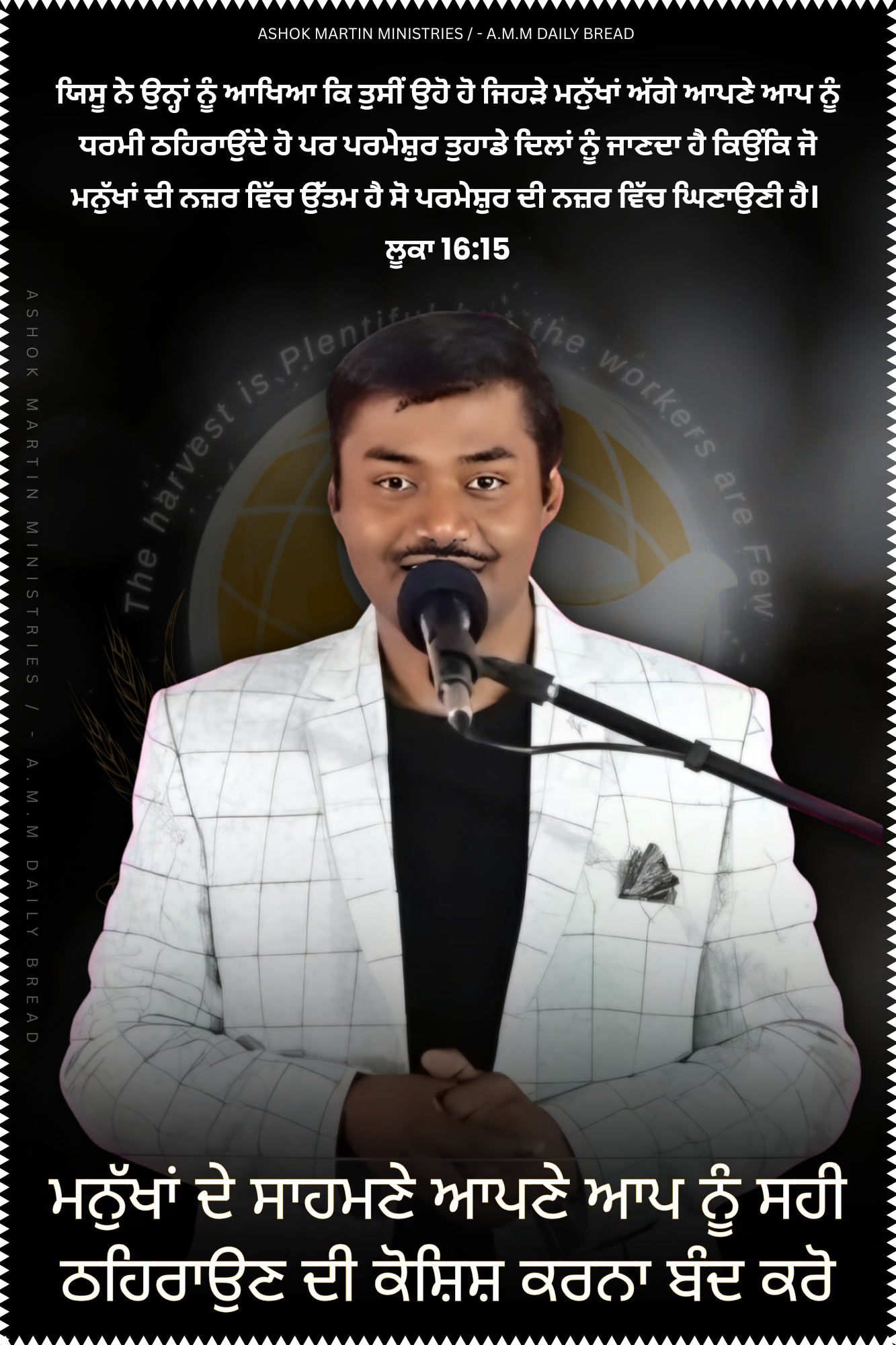_`ਯਿਸੂ ਨੇ ਉਨ੍ਹਾਂ ਨੂੰ ਆਖਿਆ ਕਿ ਤੁਸੀਂ ਉਹੋ ਹੋ ਜਿਹੜੇ ਮਨੁੱਖਾਂ ਅੱਗੇ ਆਪਣੇ ਆਪ ਨੂੰ ਧਰਮੀ ਠਹਿਰਾਉਂਦੇ ਹੋ ਪਰ ਪਰਮੇਸ਼ੁਰ ਤੁਹਾਡੇ ਦਿਲਾਂ ਨੂੰ ਜਾਣਦਾ ਹੈ ਕਿਉਂਕਿ ਜੋ ਮਨੁੱਖਾਂ ਦੀ ਨਜ਼ਰ ਵਿੱਚ ਉੱਤਮ ਹੈ ਸੋ ਪਰਮੇਸ਼ੁਰ ਦੀ ਨਜ਼ਰ ਵਿੱਚ ਘਿਣਾਉਣੀ ਹੈ। ਲੂਕਾ 16:15`_