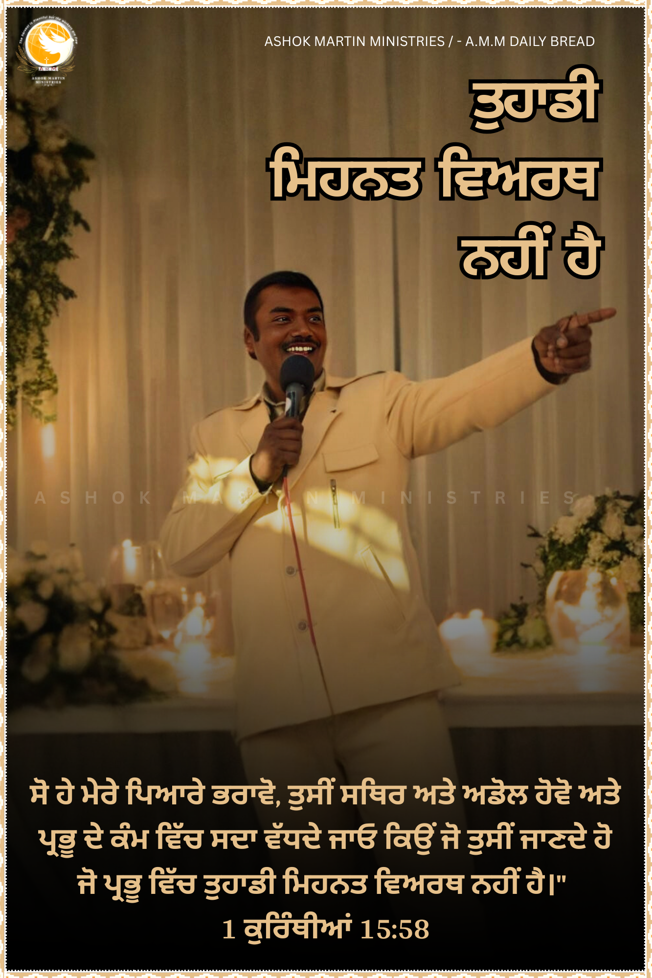 _`ਸੋ ਹੇ ਮੇਰੇ ਪਿਆਰੇ ਭਰਾਵੋ, ਤੁਸੀਂ ਸਥਿਰ ਅਤੇ ਅਡੋਲ ਹੋਵੋ ਅਤੇ ਪ੍ਰਭੂ ਦੇ ਕੰਮ ਵਿੱਚ ਸਦਾ ਵੱਧਦੇ ਜਾਓ ਕਿਉਂ ਜੋ ਤੁਸੀਂ ਜਾਣਦੇ ਹੋ ਜੋ ਪ੍ਰਭੂ ਵਿੱਚ ਤੁਹਾਡੀ ਮਿਹਨਤ ਵਿਅਰਥ ਨਹੀਂ ਹੈ।” 1 ਕੁਰਿੰਥੀਆਂ 15:58`_