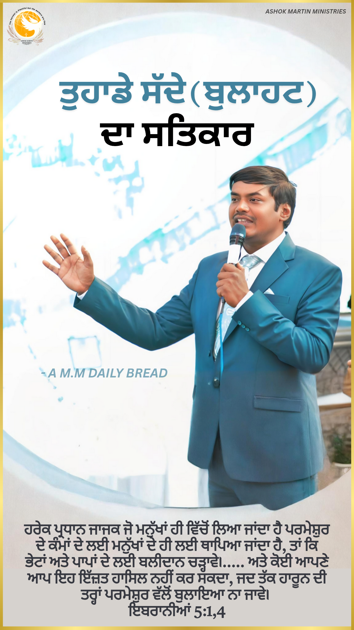 _`ਹਰੇਕ ਪ੍ਰਧਾਨ ਜਾਜਕ ਜੋ ਮਨੁੱਖਾਂ ਹੀ ਵਿੱਚੋਂ ਲਿਆ ਜਾਂਦਾ ਹੈ ਪਰਮੇਸ਼ੁਰ ਦੇ ਕੰਮਾਂ ਦੇ ਲਈ ਮਨੁੱਖਾਂ ਦੇ ਹੀ ਲਈ ਥਾਪਿਆ ਜਾਂਦਾ ਹੈ, ਤਾਂ ਕਿ ਭੇਟਾਂ ਅਤੇ ਪਾਪਾਂ ਦੇ ਲਈ ਬਲੀਦਾਨ ਚੜ੍ਹਾਵੇ।….. ਅਤੇ ਕੋਈ ਆਪਣੇ ਆਪ ਇਹ ਇੱਜ਼ਤ ਹਾਸਿਲ ਨਹੀਂ ਕਰ ਸਕਦਾ, ਜਦ ਤੱਕ ਹਾਰੂਨ ਦੀ ਤਰ੍ਹਾਂ ਪਰਮੇਸ਼ੁਰ ਵੱਲੋਂ ਬੁਲਾਇਆ ਨਾ ਜਾਵੇ। ਇਬਰਾਨੀਆਂ 5:1,4`_