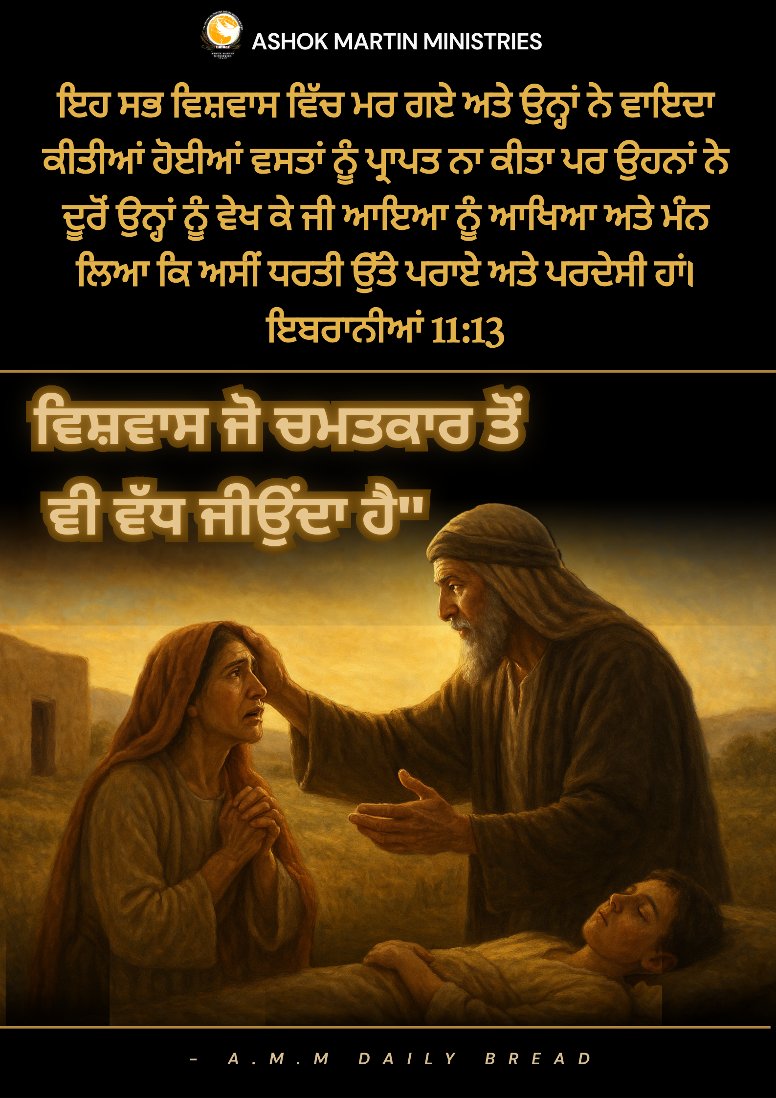 _`ਇਹ ਸਭ ਵਿਸ਼ਵਾਸ ਵਿੱਚ ਮਰ ਗਏ ਅਤੇ ਉਨ੍ਹਾਂ ਨੇ ਵਾਇਦਾ ਕੀਤੀਆਂ ਹੋਈਆਂ ਵਸਤਾਂ ਨੂੰ ਪ੍ਰਾਪਤ ਨਾ ਕੀਤਾ ਪਰ ਉਹਨਾਂ ਨੇ ਦੂਰੋਂ ਉਨ੍ਹਾਂ ਨੂੰ ਵੇਖ ਕੇ ਜੀ ਆਇਆ ਨੂੰ ਆਖਿਆ ਅਤੇ ਮੰਨ ਲਿਆ ਕਿ ਅਸੀਂ ਧਰਤੀ ਉੱਤੇ ਪਰਾਏ ਅਤੇ ਪਰਦੇਸੀ ਹਾਂ। ਇਬਰਾਨੀਆਂ 11:13 NIV`_