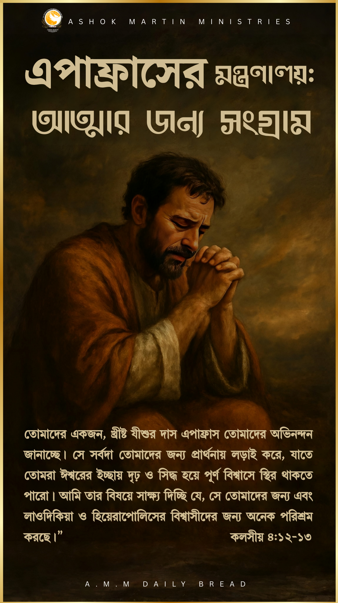 `“তোমাদের একজন, খ্রীষ্ট যীশুর দাস এপাফ্রাস তোমাদের অভিনন্দন জানাচ্ছে। সে সর্বদা তোমাদের জন্য প্রার্থনায় লড়াই করে, যাতে তোমরা ঈশ্বরের ইচ্ছায় দৃঢ় ও সিদ্ধ হয়ে পূর্ণ বিশ্বাসে স্থির থাকতে পারো। আমি তার বিষয়ে সাক্ষ্য দিচ্ছি যে, সে তোমাদের জন্য এবং লাওদিকিয়া ও হিয়েরাপোলিসের বিশ্বাসীদের জন্য অনেক পরিশ্রম করছে।” — কলসীয় ৪:১২-১৩`