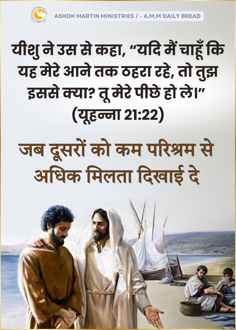 मनुष्य के लिए सबसे कठिन भावनाओं में से एक है यह अनुभव करना कि कुछ लोग जल्दी सफल हो जाते हैं या उन्हें कम मेहनत में अधिक आशीष मिलती है। तब हमारा हृदय पुकार उठता है— *“प्रभु, क्यों वह और क्यों नहीं मैं?”* यही संघर्ष पतरस के प्रश्न में झलकता है जब उसने यूहन्ना के विषय में पूछा: *“हे प्रभु, इसका क्या होगा?”* यीशु का उत्तर बहुत तीखा था: *“तुझ से क्या? तू मेरे पीछे हो ले।”*