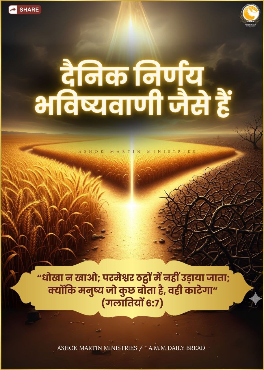 हर दिन आप एक चौराहे पर खड़े होते हैं, और आपका हर निर्णय आपके भविष्य से बातें करता है। बाइबल स्पष्ट कहती है: आपके दैनिक निर्णय बीज हैं, और वे बीज भविष्यवाणी जैसे हैं—वे तय करते हैं कि आप कल किस प्रकार की फसल काटेंगे।