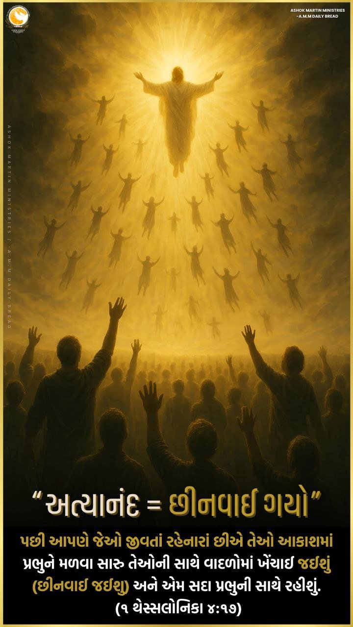 પછી આપણે જેઓ જીવતાં રહેનારાં છીએ તેઓ આકાશમાં પ્રભુને મળવા સારુ તેઓની સાથે વાદળોમાં ખેંચાઈ જઈશું (છીનવાઈ જઈશુ) અને એમ સદા પ્રભુની સાથે રહીશું. (૧ થેસ્સલોનિકા ૪:૧૭)