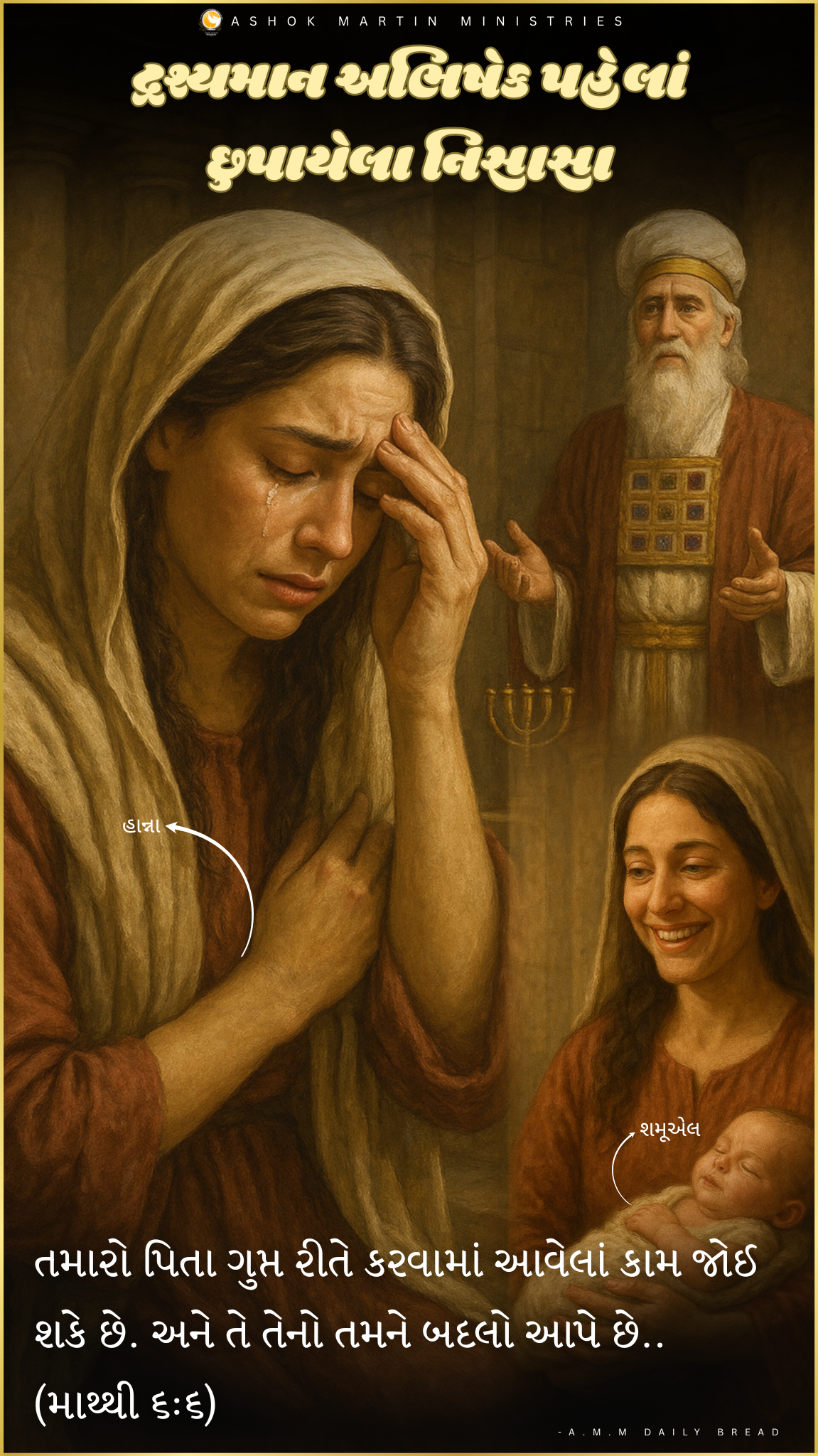 જાહેર અભિષેક એ ગુપ્ત નિસાસાનો દૃશ્યમાન પુરસ્કાર છે. મંદિરમાં હાન્નાનાં આંસુ કોઈને ખબર ન હતી, પરંતુ તેઓએ શમૂએલને જન્મ આપ્યો, એક પ્રબોધક જેની સેવાએ ઇઝરાયલને આકાર આપ્યો (૧ શમૂએલ ૧:૧૦-૨૦). કાર્મેલ પર્વત પર એલિયાના જાહેરમાં અગ્નિની હાકલ પહેલાં છુપાયેલા નિસાસા હતા, જયારે તે તેમનું માથું તેમના ઘૂંટણ વચ્ચે રાખીને વરસાદ માટે પીડાતા પ્રાર્થના કરતા હતા (૧ રાજાઓ ૧૮:૪૨-૪૫). પરમેશ્વરના પુત્ર ઈસુ પણ ગેથસેમાનેમાં એવી વેદનામાં પ્રવેશ્યા, એટલી તીવ્રતાથી પ્રાર્થના કરી કે તેમનો પરસેવો લોહીના ટીપાં જેવો થઈ ગયો (લૂક ૨૨:૪૪). તે છુપાયેલા નિસાસાએ તેમને જાહેરમાં ક્રોસને ભેટવા માટે શક્તિ આપી. અને પરમેશ્વરે તેમને મહિમામય કર્યા.