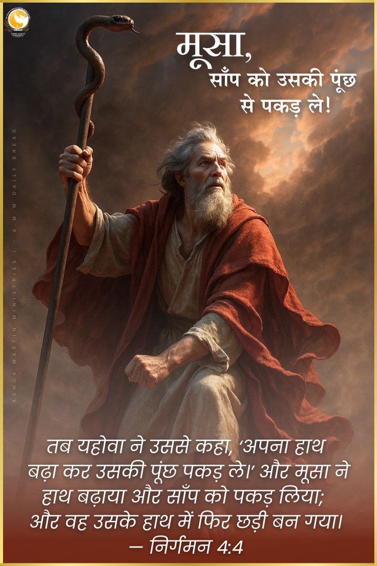 > “तब यहोवा ने उससे कहा, ‘अपना हाथ बढ़ा कर उसकी पूंछ पकड़ ले।’ और मूसा ने हाथ बढ़ाया और साँप को पकड़ लिया; और वह उसके हाथ में फिर छड़ी बन गया।” — *निर्गमन 4:4*