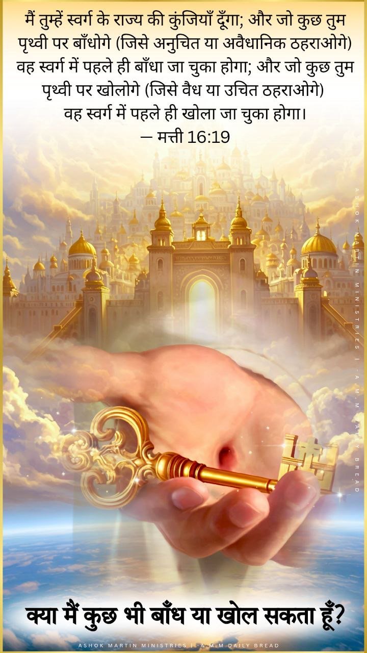 “मैं तुम्हें स्वर्ग के राज्य की कुंजियाँ दूँगा; और जो कुछ तुम पृथ्वी पर बाँधोगे (जिसे अनुचित या अवैधानिक ठहराओगे) वह स्वर्ग में पहले ही बाँधा जा चुका होगा; और जो कुछ तुम पृथ्वी पर खोलोगे (जिसे वैध या उचित ठहराओगे) वह स्वर्ग में पहले ही खोला जा चुका होगा।”— मत्ती 16:19 (AMPC)