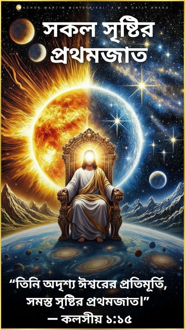 তিনি কোনও উচ্চতর সৃষ্টি নন, বরং *সিংহাসনে বসে থাকা সৃষ্টিকর্তা।* “প্রথমজাত” সেই ব্যক্তি, যিনি *রাজত্ব করেন,* যিনি *সমস্ত কিছুর অধিকারী,* এবং যিনি *অদৃশ্য ঈশ্বরের দৃশ্য প্রতিরূপ।* তাঁর মধ্যে আমরা পিতার মুখ দেখি — করুণা, সত্য ও মহিমার জীবন্ত প্রকাশ।