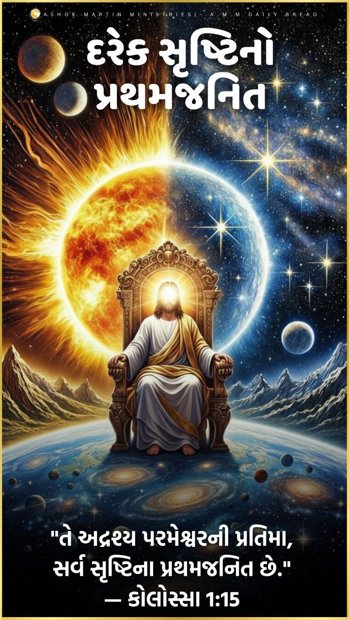 તેને *સૃષ્ટિમાં* ગણવામાં આવતો નથી, કારણ કે *તે સર્જનનો સ્ત્રોત છે.* તે ઉન્નત પ્રાણી નથી, પરંતુ *સર્જક* સિંહાસન પર બિરાજમાન છે.* પ્રથમજનિત તે છે જે *રાજ કરે છે*, જે *બધાનો વારસદાર*, અને *અદ્રશ્ય પરમેશ્વરની *દૃશ્યમાન છબી* છે. તેનામાં, આપણે પિતાનો ચહેરો જોઈએ છીએ – દયા, સત્ય અને મહિમાનું પ્રગટ અવતાર.