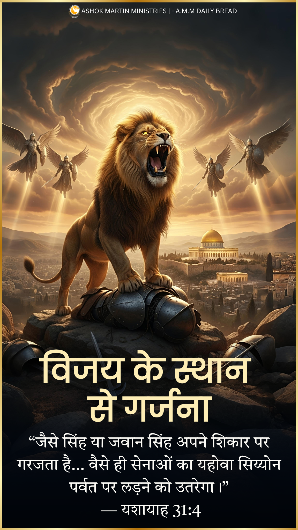 शत्रु आपकी आवाज़ से नहीं, आपके अधिकार से डरता है। इसलिए हर परिस्थिति पर खड़े हो जाओ और यीशु की विजय को गर्जो। अपने नगर, अपने परिवार, अपने भविष्य पर विजय की घोषणा करो। यह गर्जना उस व्यक्ति की नहीं है जो जीत की खोज में है, बल्कि उस व्यक्ति की है जो पहले से मिली हुई विजय की रक्षा कर रहा है।