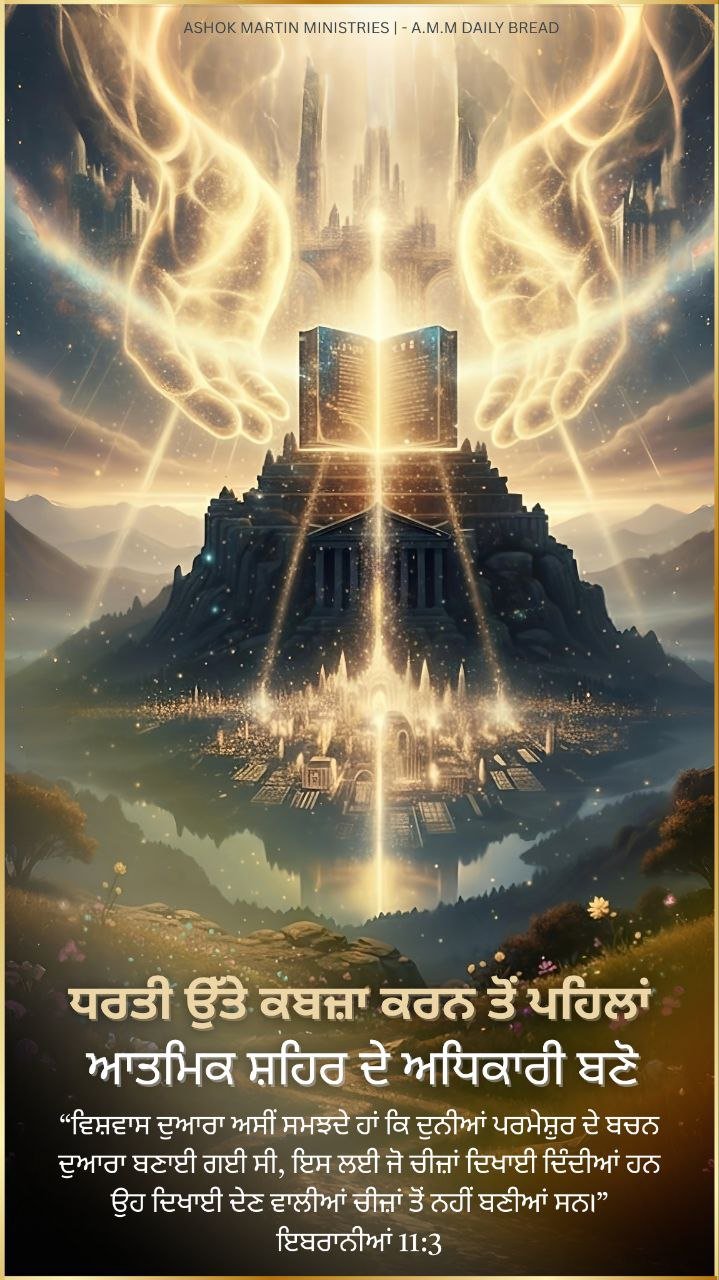 ਹਰ ਦਿਸਣ ਵਾਲੇ ਸ਼ਹਿਰ ਦੇ ਪਿੱਛੇ ਇੱਕ ਅਦਿੱਖ ਸ਼ਹਿਰ ਹੁੰਦਾ ਹੈ। ਹਰ ਦਿਸਣ ਵਾਲੀ ਧਰਤੀ ਜਿਸ ਵਿੱਚ ਤੁਸੀਂ ਕਦਮ ਰੱਖਦੇ ਹੋ, ਤੁਹਾਡੇ ਪਹੁੰਚਣ ਤੋਂ ਪਹਿਲਾਂ ਹੀ ਇੱਕ ਆਤਮਿਕ ਢਾਂਚਾ ਪਹਿਲਾਂ ਹੀ ਬਣਾਇਆ ਗਿਆ ਹੁੰਦਾ ਹੈ। ਜਿਸਨੂੰ ਲੋਕ ਦੇਸ਼ ਜਾਂ ਕਸਬਾ ਕਹਿੰਦੇ ਹਨ, ਸਵਰਗ ਉਸਨੂੰ ਇੱਕ ਹੋਰ ਨਾਮ ਨਾਲ ਬੁਲਾਉਂਦਾ ਹੈ। ਕੁਲੁੱਸੀਆਂ 1:15 ਕਹਿੰਦਾ ਹੈ, _“ਉਹ ਅਦਿੱਖ ਪਰਮੇਸ਼ੁਰ ਦਾ ਰੂਪ ਹੈ।”_ ਅਦਿੱਖ ਦ੍ਰਿਸ਼ਟੀ ਦਾ ਬਲੂਪ੍ਰਿੰਟ ਹੈ। ਜਦੋਂ ਤੱਕ ਕੋਈ ਮਨੁੱਖ ਆਤਮਾ ਵਿੱਚ ਰਾਜ ਨਹੀਂ ਕਰਦਾ, ਉਹ ਧਰਤੀ ਉੱਤੇ ਰਾਜ ਨਹੀਂ ਕਰ ਸਕਦਾ।