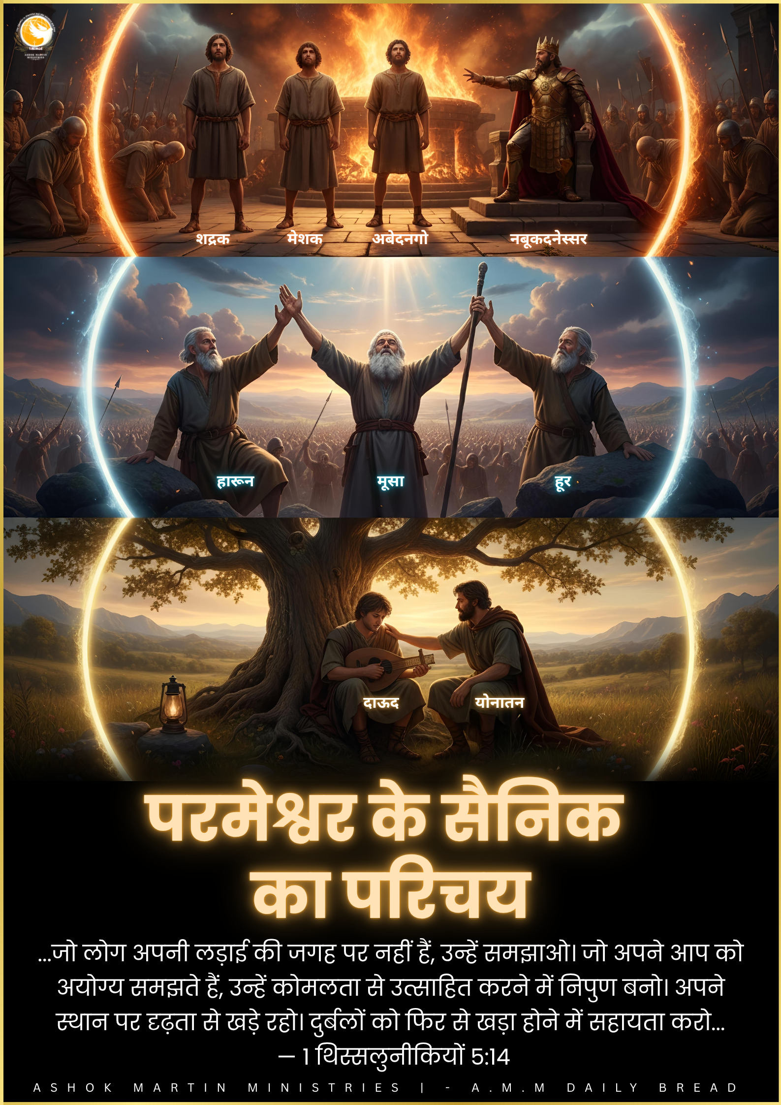 > `“…जो लोग अपनी लड़ाई की जगह पर नहीं हैं, उन्हें समझाओ। जो अपने आप को अयोग्य समझते हैं, उन्हें कोमलता से उत्साहित करने में निपुण बनो। अपने स्थान पर दृढ़ता से खड़े रहो। दुर्बलों को फिर से खड़ा होने में सहायता करो…” — 1 थिस्सलुनीकियों 5:14 (TPT)`