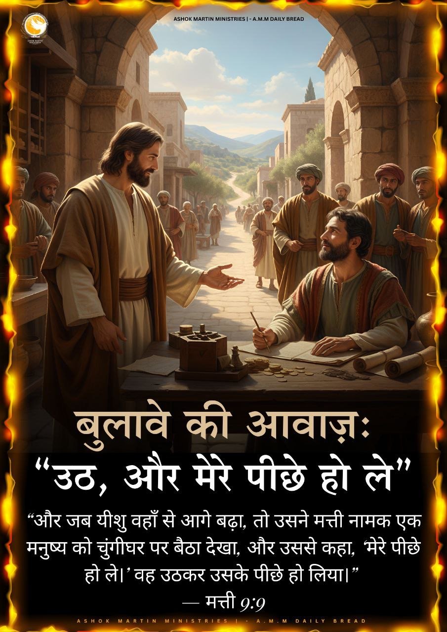 > “और जब यीशु वहाँ से आगे बढ़ा, तो उसने मत्ती नामक एक मनुष्य को चुंगीघर पर बैठा देखा, और उससे कहा, ‘मेरे पीछे हो ले।’ वह उठकर उसके पीछे हो लिया।” — मत्ती 9:9