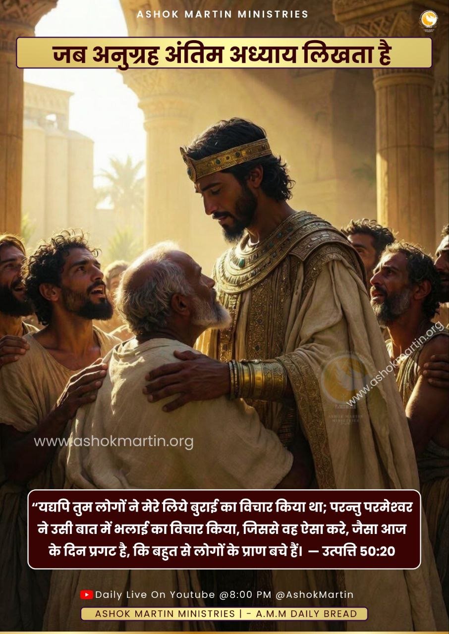 *उत्पत्ति 42–45* में, जो अकाल याकूब के पुत्रों को मिस्र ले गया, वही *मेल-मिलाप का पुल* बन गया। यूसुफ़ ने आँसू बहाए — कमजोरी में नहीं, बल्कि *आशा में।* उसे समझ आ गया कि हर विश्वासघात, हर जेल, हर आँसू — *जीवन बचाने की परमेश्वर की योजना का हिस्सा था।*