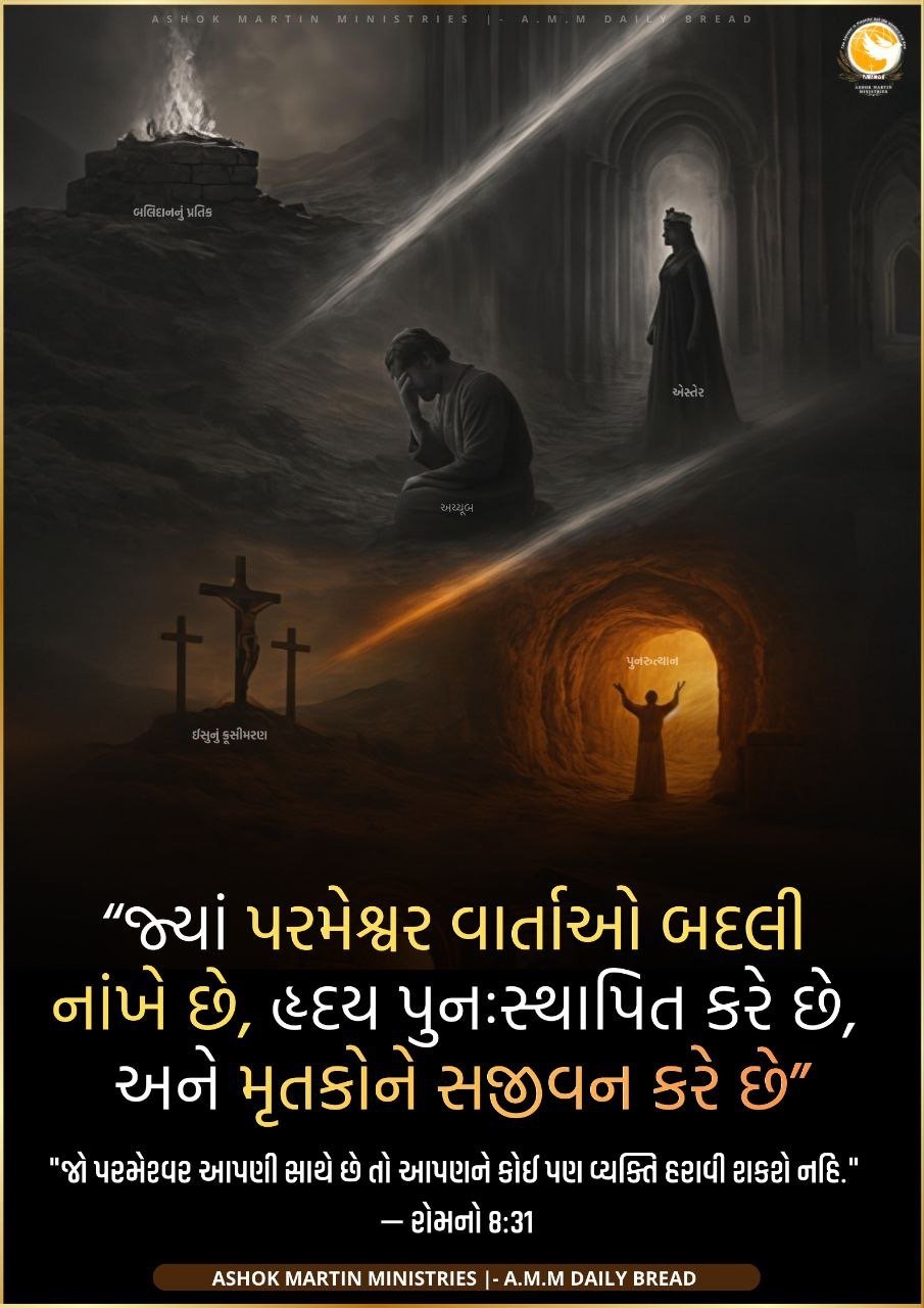આજના વાંચનમાં, આપણે પરમેશ્વરની શક્તિનો એક અદ્ભૂત પ્રવાહ જોઈ શકીએ છીએ – કર્મકાંડમાં વેદીથી લઈને અયૂબની પીડા સુધી, એસ્તેરની છુપાયેલી હિંમતથી લઈને કાલ્વરીની ટેકરી સુધી, અને અંતે કરીંથીઓમાં પુનરુત્થાનના વિજય સુધી.
