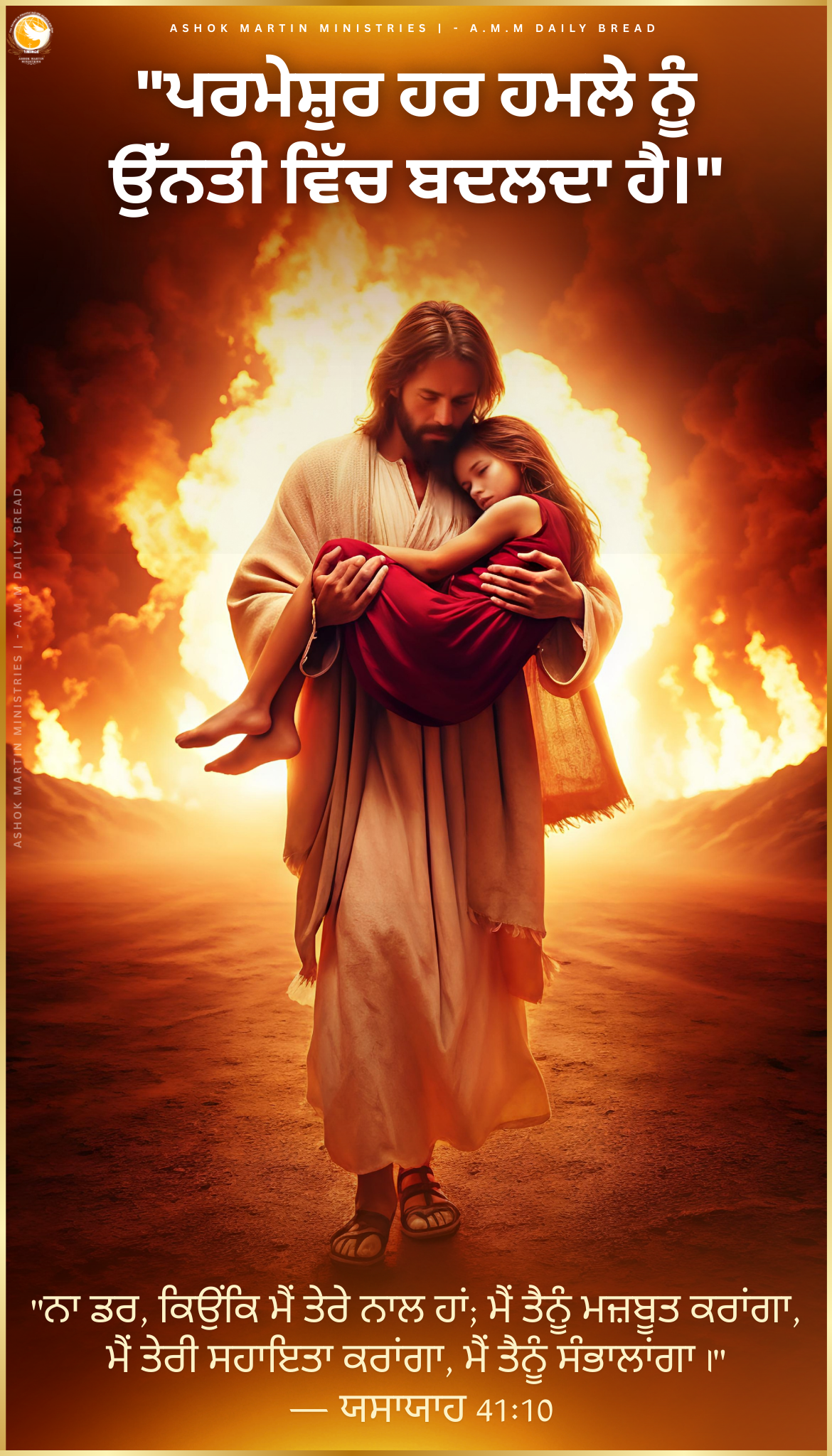 > `”ਨਾ ਡਰ, ਕਿਉਂਕਿ ਮੈਂ ਤੇਰੇ ਨਾਲ ਹਾਂ; ਮੈਂ ਤੈਨੂੰ ਮਜ਼ਬੂਤ ਕਰਾਂਗਾ, ਮੈਂ ਤੇਰੀ ਸਹਾਇਤਾ ਕਰਾਂਗਾ, ਮੈਂ ਤੈਨੂੰ ਸੰਭਾਲਾਂਗਾ।” — ਯਸਾਯਾਹ 41:10`