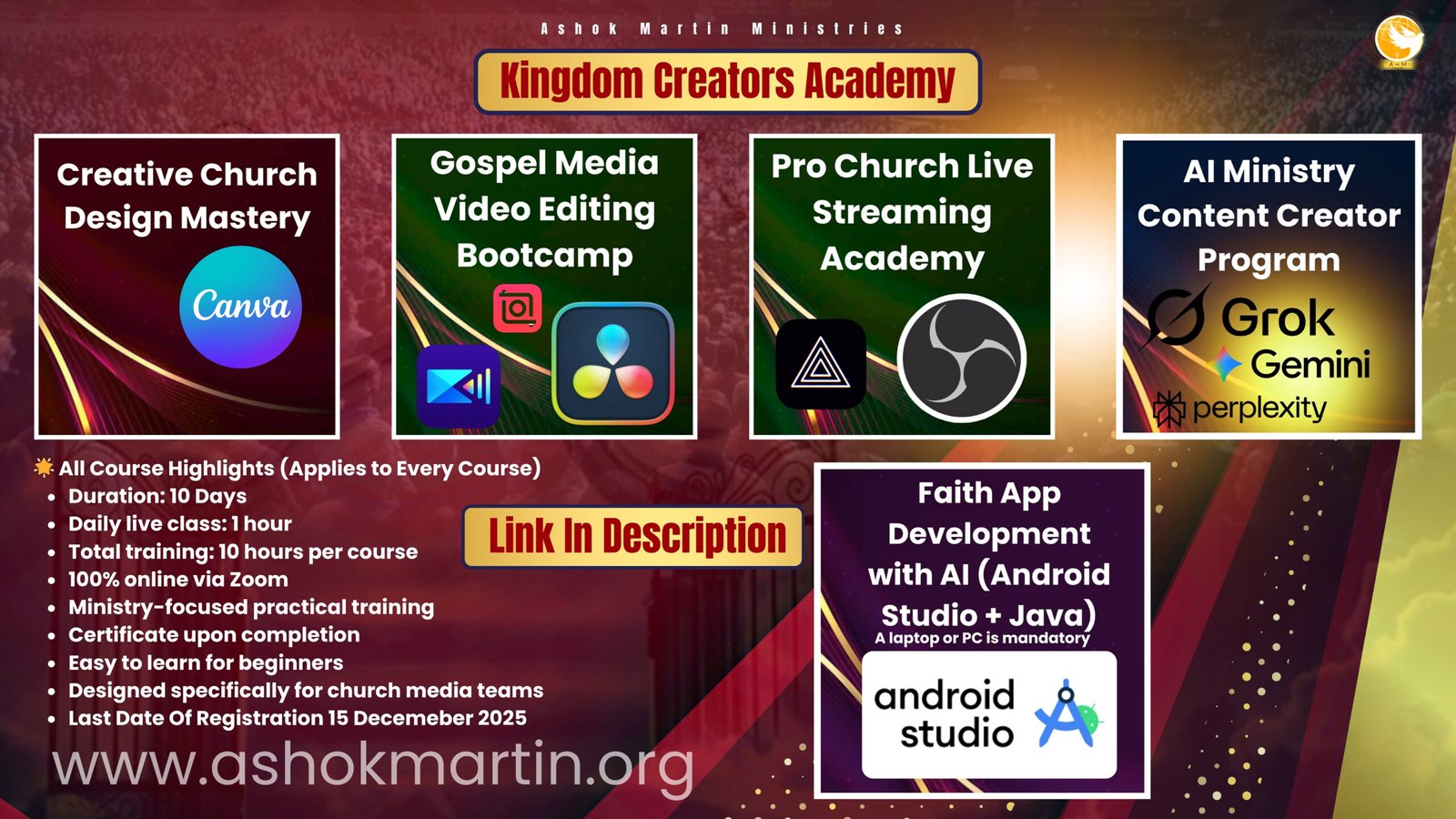 इसमें छात्र AI की सहायता से Sermon summaries, content ideas, thumbnails, ministry posts, captions, YouTube titles और automated workflows तैयार करना सीखेंगे — सिर्फ मोबाइल से।