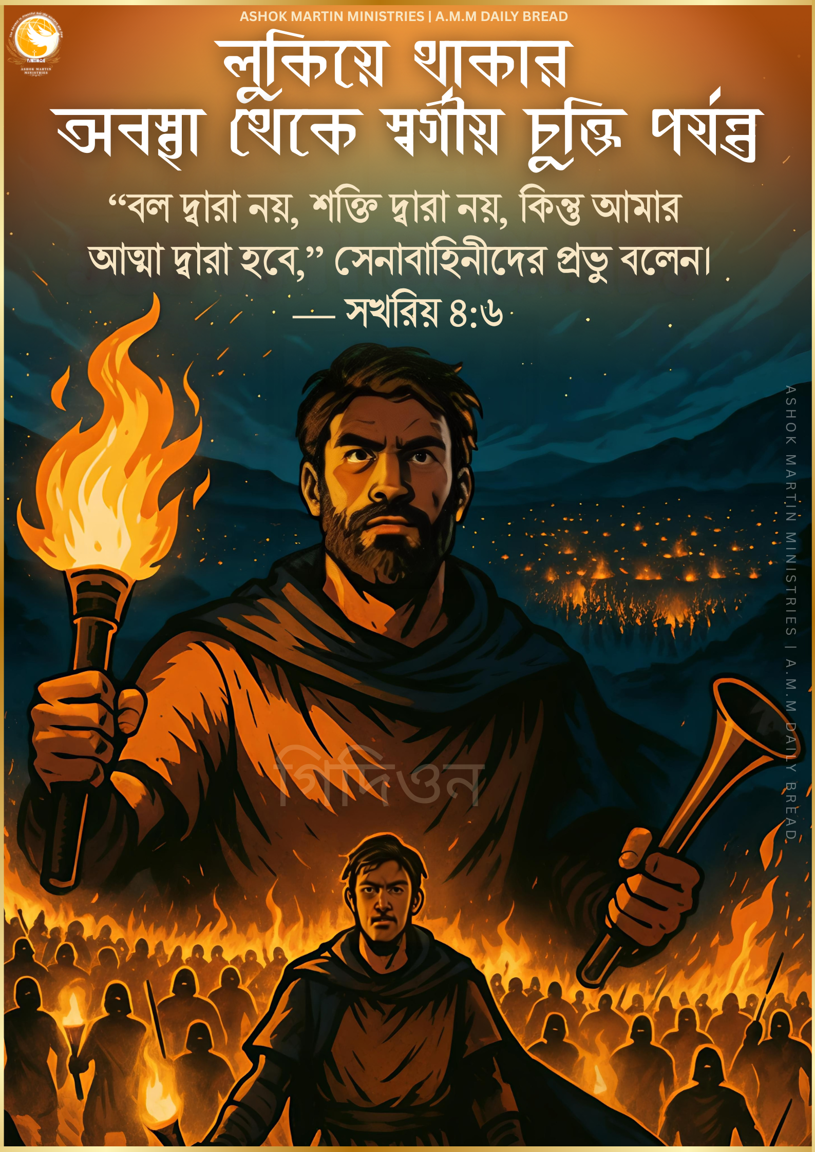 ঈশ্বর গিদিয়নকে লুকিয়ে থাকতে দেখেন, কিন্তু তাকে বীর যোদ্ধা বলে ডাকেন। স্বর্গ আমাদের ভয় দ্বারা নয়, আমাদের ডাক দ্বারা পরিচয় দেয় (বিচারকগণ ৬)। মুক্তির শুরু শত্রুদের সঙ্গে নয়, বরং গোপন মূর্তিগুলো ভেঙে ফেলার মাধ্যমে হয়। যে বিজয় ঈশ্বরকে ভুলে যায়, তা শেষ পর্যন্ত দুর্নীতিতে পরিণত হয়—আবীমেলেকের জীবন প্রমাণ করে যে আজ্ঞাপালন ছাড়া উচ্চাকাঙ্ক্ষা শেষ পর্যন্ত ধ্বংস ডেকে আনে (বিচারকর্ত্ত্গন ৮–৯)।